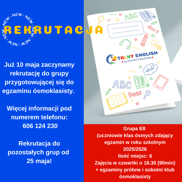 Już 10 maja zaczynamy rekrutację na kolejny rok szkolny. Startujemy od grupy dedykowanej uczniom zdającym egzamin ósmoklasisty w roku szkolnym 2025/2026. Zajęcia w czwartki o 18.30, 90 min. W grupie będzie max. 8 osób. Obecnie mamy 6 wolnych miejsc. Aby dostać się do grupy, należy zdać egzamin wstępny. Termin egzaminu ustalimy przy zapisie. Zapraszam do kontaktu telefonicznego: 606124230.